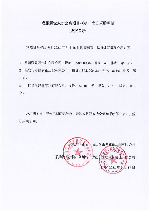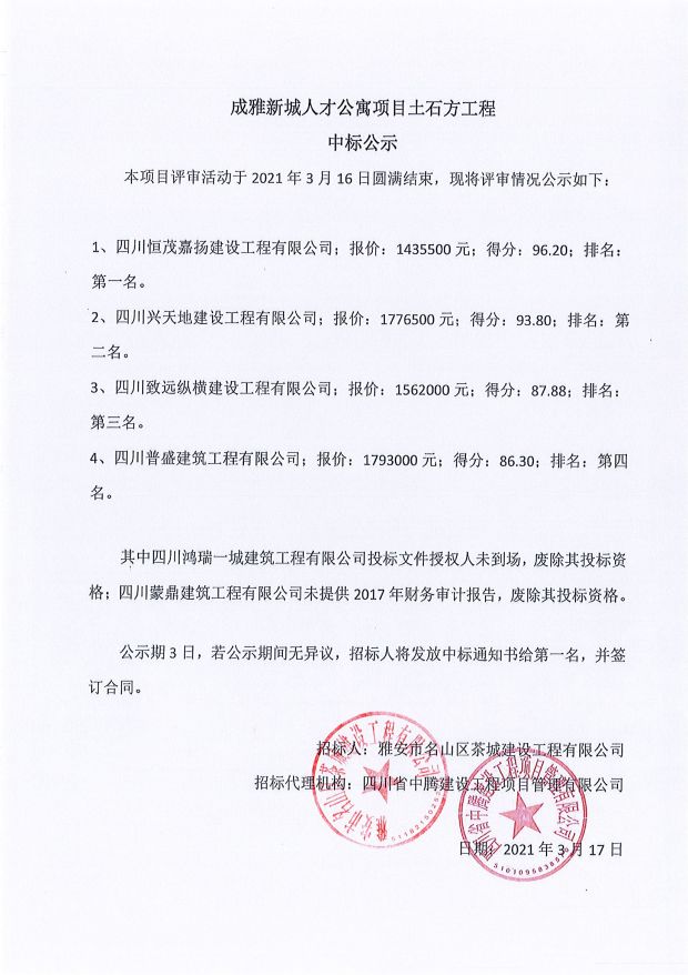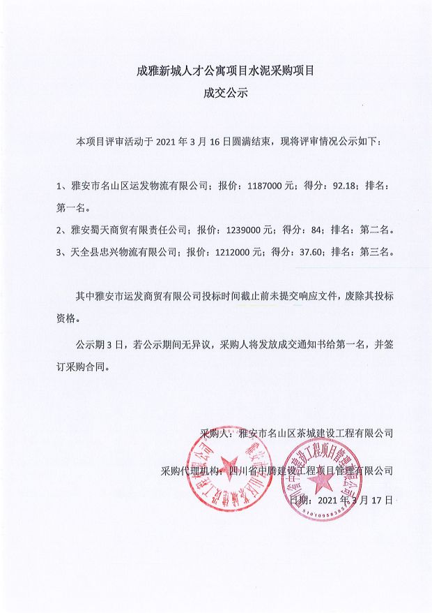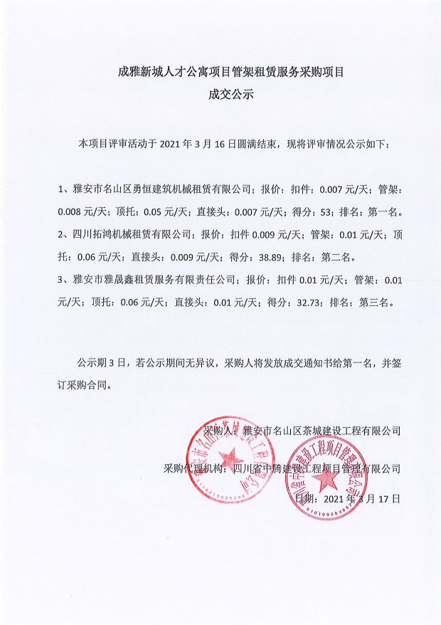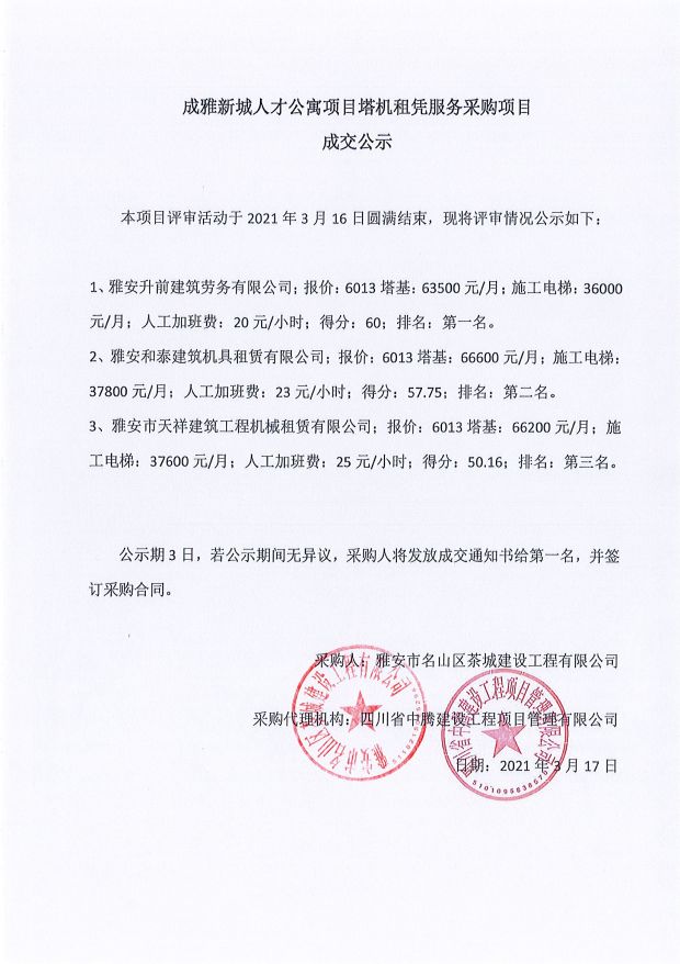 成雅新城人才公寓砂石、塔機(jī)租賃、土石方、鋼材、管架租賃、模板木方、水泥采購項目成交公示